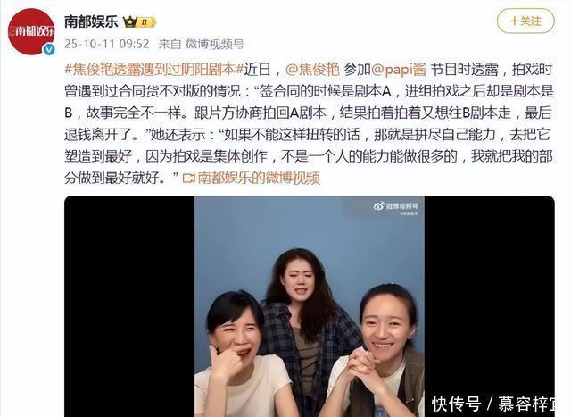 拍戏遇阴阳剧本 最近女演员焦俊艳参加了papi酱的线上节目,在聊天时透露出一个大瓜, 表示自己曾经在拍摄时遇到过剧组给到的阴阳剧本。